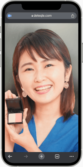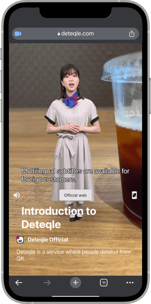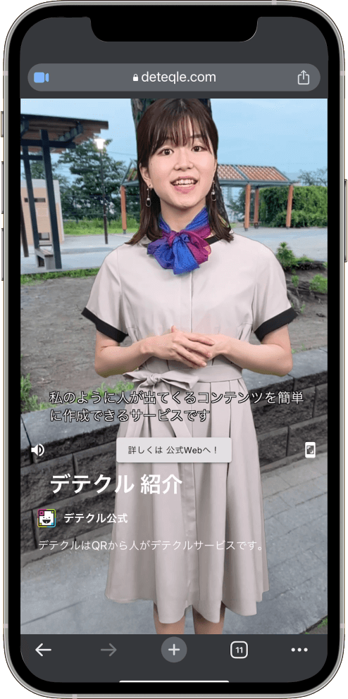 iOS/Android端末で、QRコードを読み込む または URL とブラウザが起動し、スマートフォン越しに人動画コンテンツが再生されます。QRコードの読み込みは、iOS/Android端末に標準でインストールされているカメラやQRコードリーダーなどの読み込むことができます。その為 再生用のアプリのインストールは不要です。